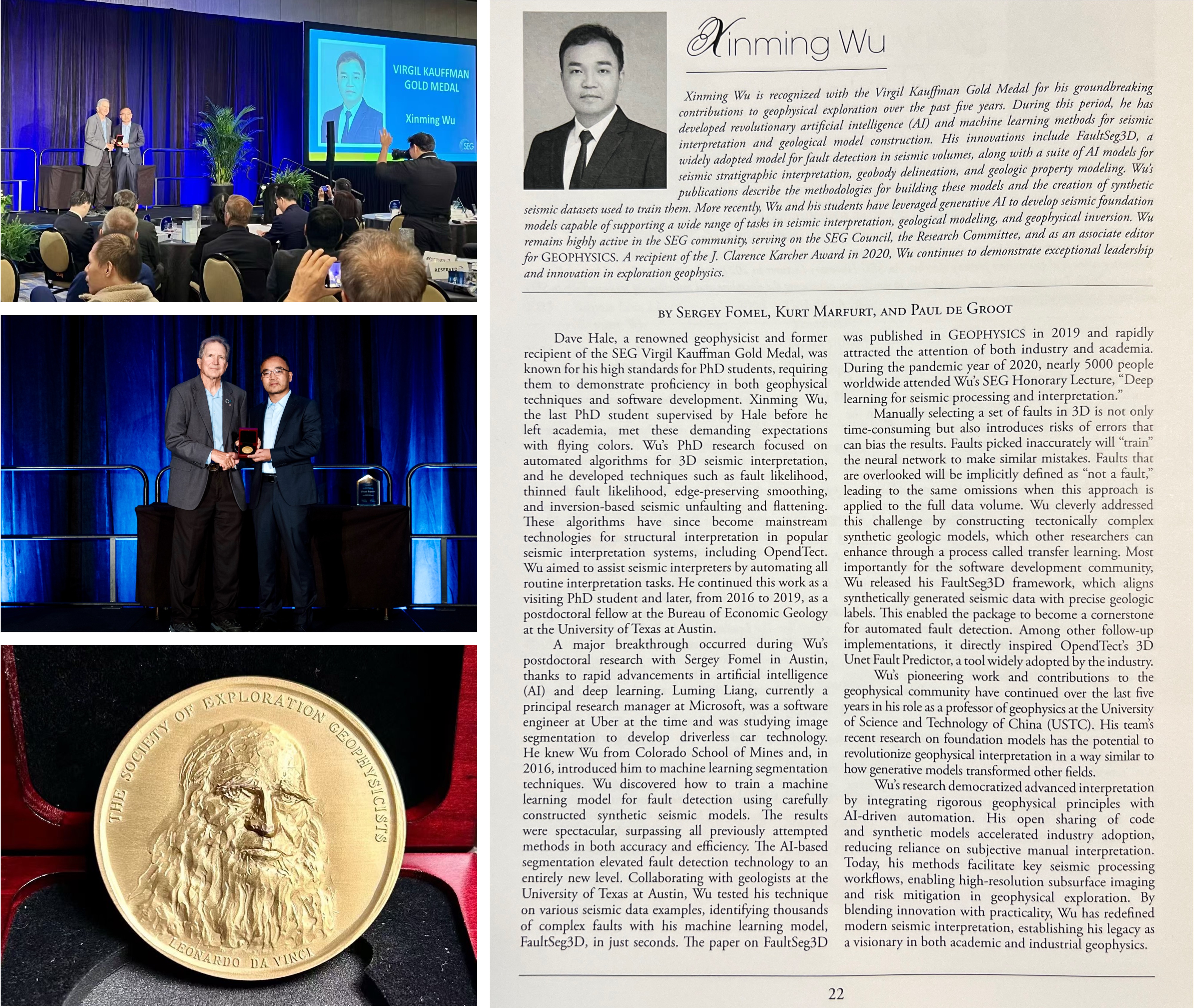 "Xinming Wu is recognized with the Virgil Kauffman Gold Medal for his groundbreaking contributions to geophysical exploration over the past five years. During this period, he has developed revolutionary artificial intelligence (AI) and machine learning methods for seismic interpretation and geological model construction. His innovations include FaultSeg3D, a widely adopted model for fault detection in seismic volumes, along with a suite of Al models for seismic stratigraphic interpretation, geobody delineation, and geologic property modeling. Wu's publications describe the methodologies for building these models and the creation of synthetic